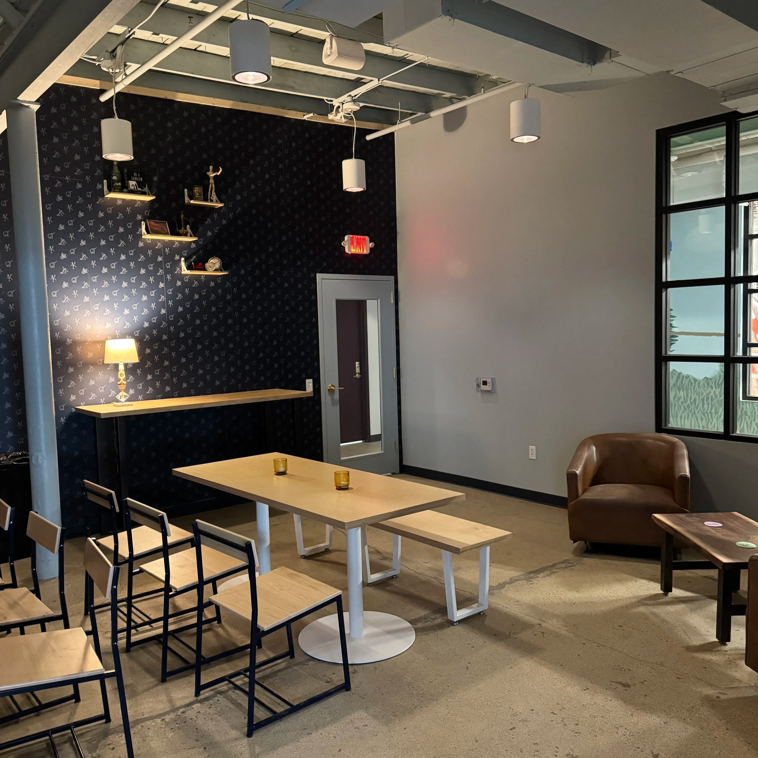 A: Our event space has a projector, comfortable seating at tables and standalone, lovely serving tables, a sliding door for privacy, and a fun but tasteful decor. Guests can make the short walk to the bar and have easy restroom and patio access.