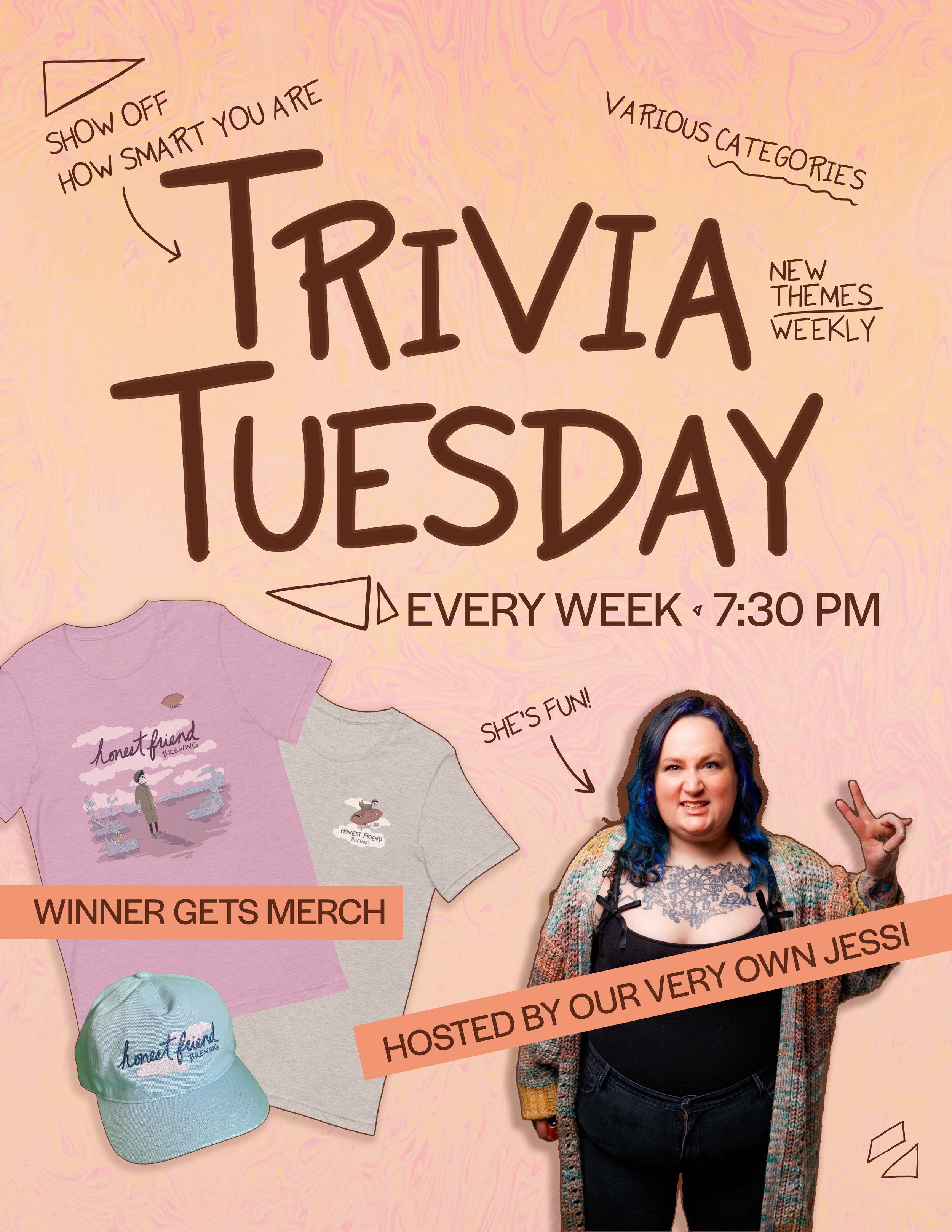 Come play some trivia with our very own Jessi as the host. Topics cover a range of subject matter. Prizes are abundant. Repeats every Tuesday.